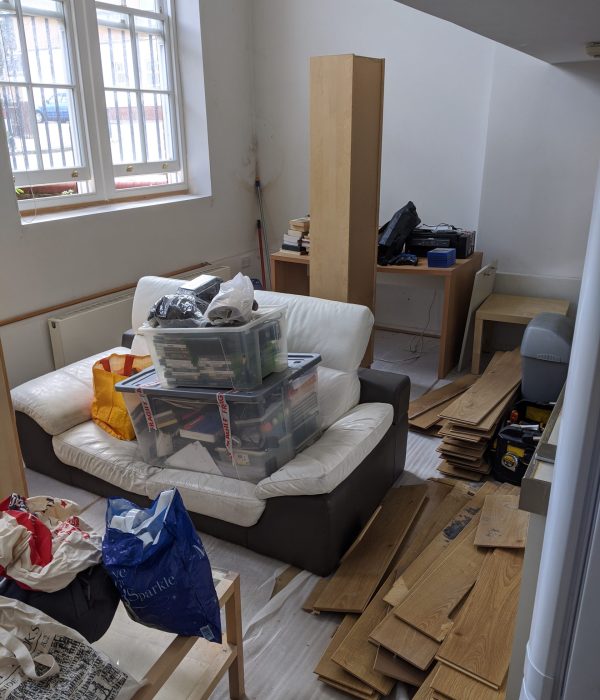 After just two weeks of commuting combined with long working days of 12+ hours it became obvious I couldn’t maintain the pace. I decided to move into the apartment, leaving the kids at home to fend for themselves, so I could get some productivity flowing. It was a game changer being on site and being able to work 16 hours on a project however this threw up a new challenge; I was working faster than materials were arriving as they had been planned to arrive based on the old timeline, so I had a great idea…”I know! Rather than work room by room, staying tidy and organised, I’ll rip EVERYTHING out all at once.” The kitchen, the bathroom, all floors, all doors etc so I could work from a completely blank canvas. In theory it sounded sensible, smart and efficient. That is, unless you’re trying to live there which was a first for me. (I’ve actually lived in a few properties full time while I renovate due to distance!)